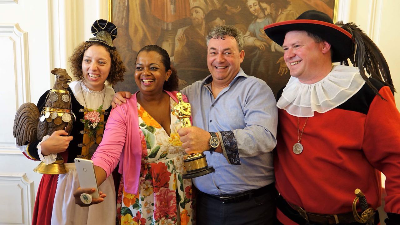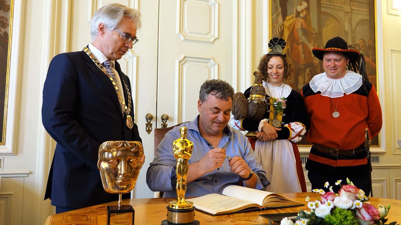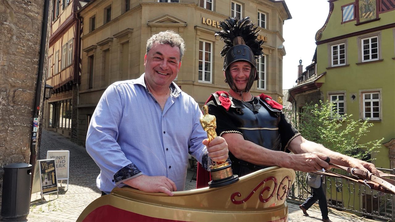 Anschließend trägt sich Gerd Nefzer in das Goldene Buch der Stadt Schwäbisch Hall ein. Jubel und Applaus schließen den Akt ab. Nun ist es soweit. Bafta und Oscar werden weitergereicht und fotografiert. Zum Abschluss verlässt Nefzer den Haller Marktplatz in einem römischen Streitwagen die Szene. Filmreif.
