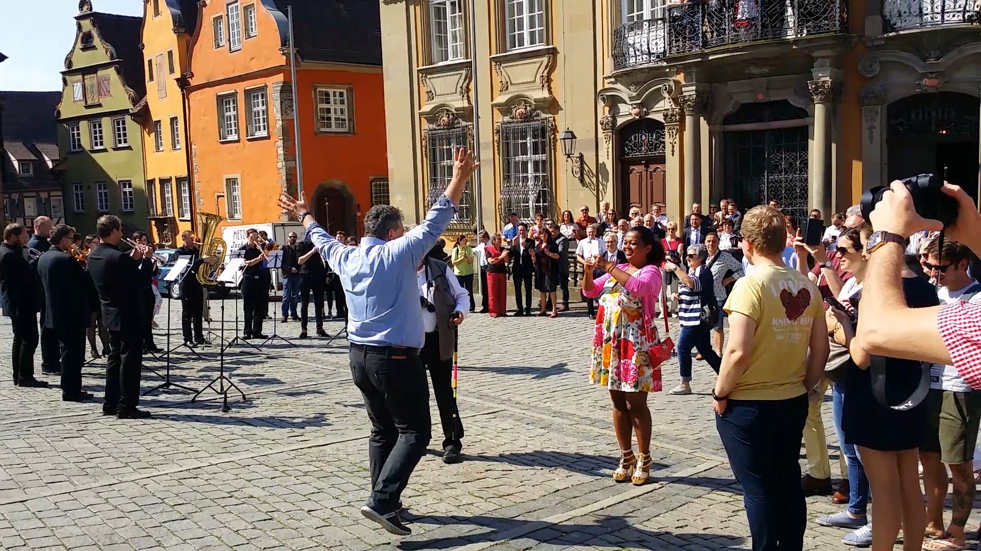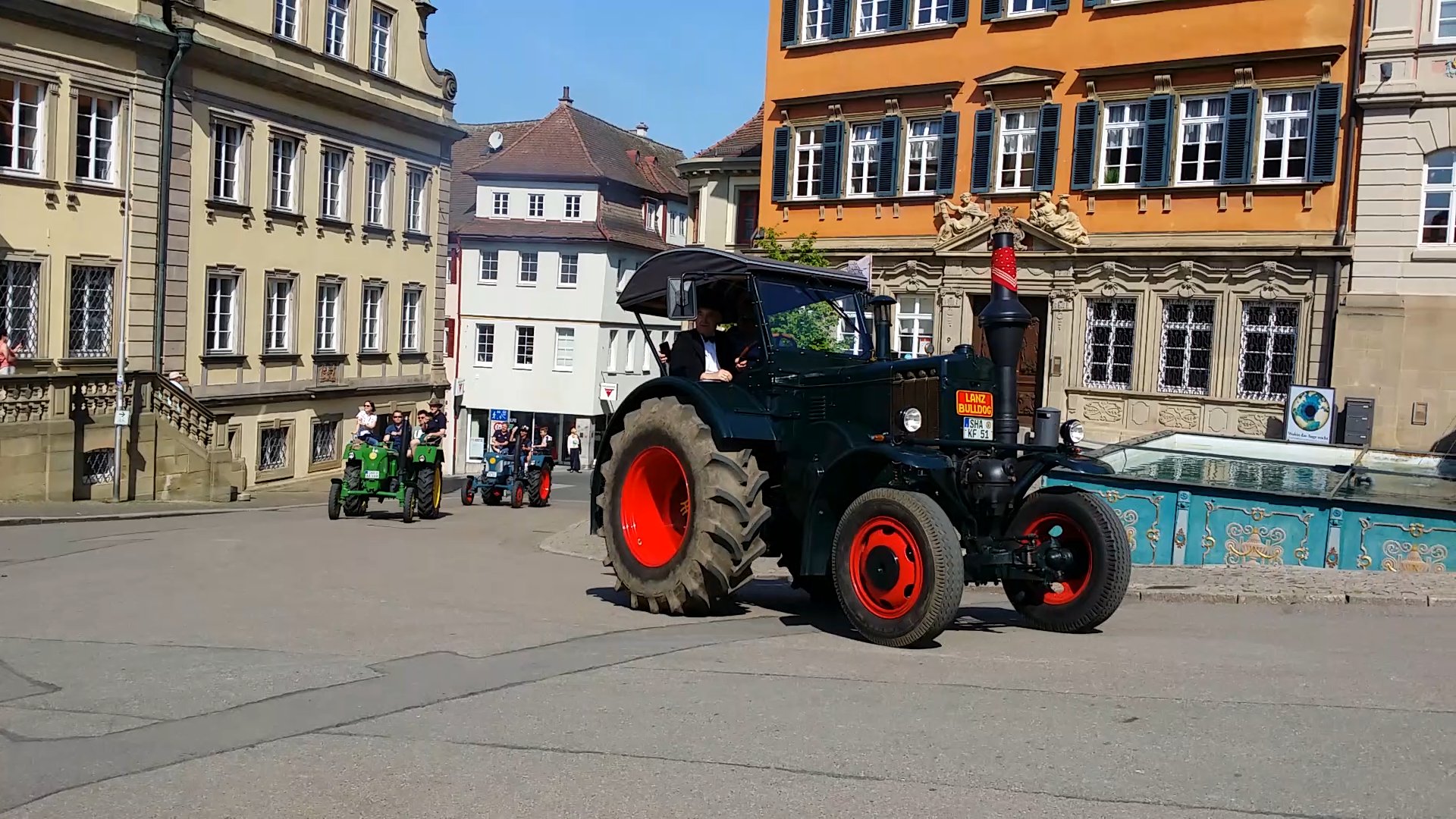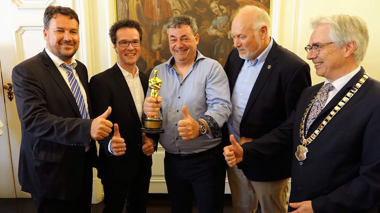Schwäbisch Hall 22. April 2018. Die Gäste versammelten sich bereits vor dem Rathaus in Schwäbisch Hall. Das Blechbläserensemble des Stadtorchesters unter der Leitung von Daniel Schneider haben sich positioniert. Jetzt kann er kommen. Und dann hört man es auch schon rattern. Gerd Nefzer wird mit einem historischen Traktor, in Begleitung der Technikfreunde des Freilandmuseums Wackerhofen, vorgefahren. Er steigt ab und geht mit erhobenen, winkenden Armen der Menge entgegen. Die Musik setzt ein. Wie im Film. In seiner späteren Rede weißt Nefzer darauf hin, das Familie und Freundschaft für ihn das wichtigste ist. Das merkt man an bei der Ankunft. Die Familie und die Freunde werden herzlichst umarmt. Auch irgendwie steht er nicht so wirklich im Mittelpunkt, sondern die beiden Preise. Der britische Bafta-Award und der Oscar und alle können daran teilhaben. „Wer möchte kann später noch eine Foto machen und natürlich die Trophäen in die Hand nehmen“, sagt Nefzer als sei es ein selbstverständliches.